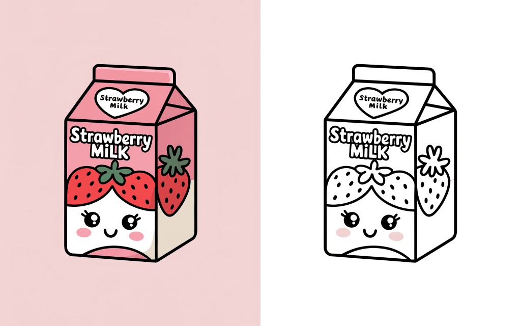 A cute strawberry milk box with rosie cheeks. Soft pinks, reds, and imaginative carton designs find this page ideal.